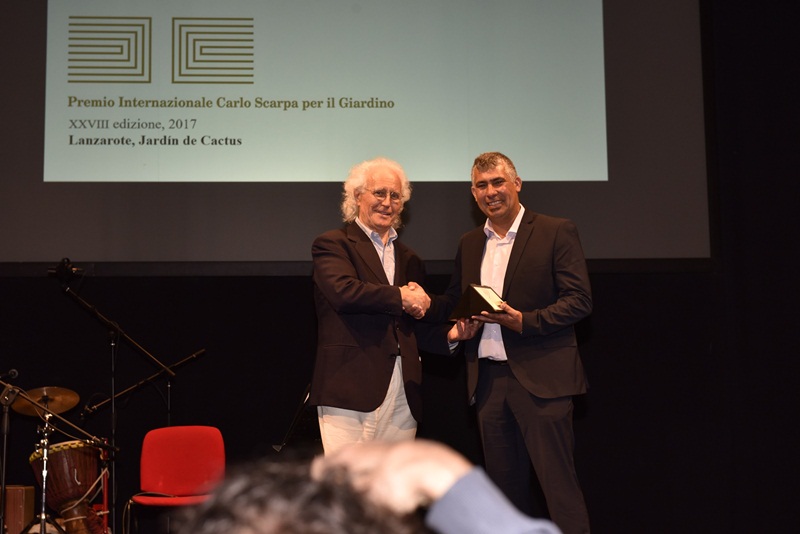 El jardinero del Jardín de Cactus, Antonio Martín, recogió este sábado por la noche el premio Carlo Scarpa 2017 de manos de Luciano Benetton, presidente de la Fundación Benetton, en el transcurso de un acto solemne celebrado en el Teatro Comunale de la ciudad italiana de Treviso, que contó con la presencia del presidente del Cabildo de Lanzarote, Pedro San Ginés. La prestigiosa entidad italiana concedió el galardón de esta edición al centro turístico creado por César Manrique en señal de reconocimiento a un espacio que "expresa el valor del paisaje agrícola de Lanzarote y representa una etapa significativa en la historia de una isla que ha sabido renacer una y otra vez de etapas de fragilidad, extrayendo de estas condiciones las razones económicas y los medios culturales necesarios para construir, partiendo de su propio suelo, formas inéditas de asentamiento, prácticas agrícolas extraordinarias y miradas estéticas, enlazadas por una visión política a largo plazo".