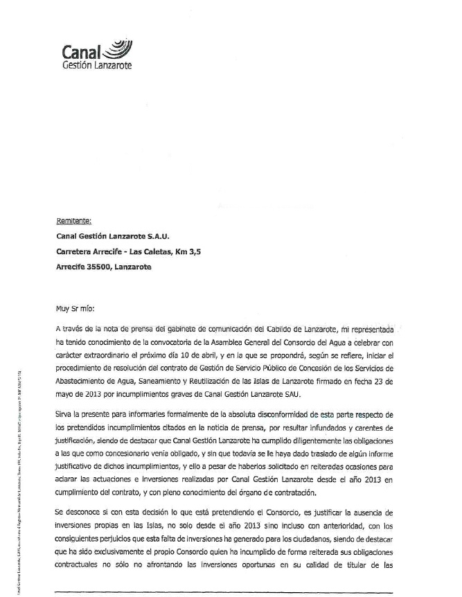 Aseguran, por otro lado, que el Consorcio ha incumplido sus obligaciones contractuales al no realizar las inversiones necesarias y no revisar los precios pactados, lo que ha causado una pérdida sustancial de ingresos para Canal Gestión Lanzarote. Concretamente, “una pérdida sustancial de Ingresos por un importe superior a los treinta millones de euros como bien les consta”, señala el burofax.