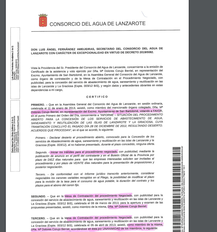 Pese a que en la sesión plenaria celebrada este jueves en La Graciosa, la consejera socialista, Ariagona Gonzalez, volvió a insistir en que esa negociación para el ciclo integral del agua la llevó Pedro San Ginés, Oswaldo Betancort mostró dos certificaciones, una del entonces secretario del Consorcio del Agua, y otra de la secretaria de la Comisión Negociadora en el procedimiento de negociación con publicidad, donde consta la participación de Mª Dolores Corujo en todo el proceso de adjudicación del ciclo integral del agua a Canal Gestión.