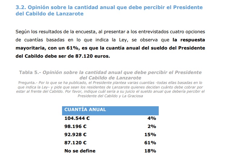 Betancort ofrecía 4 posibilidades: 87.000, 92.000, 98.000 o 104.000 euros. Con un total de 300 entrevistas realizadas a una muestra de población residente, mayor de 18 años, el 61% de la sociedad ha decidido que el sueldo del máximo representante insular debía ser de 87.120 euros; el sueldo más bajo de los ofrecidos.