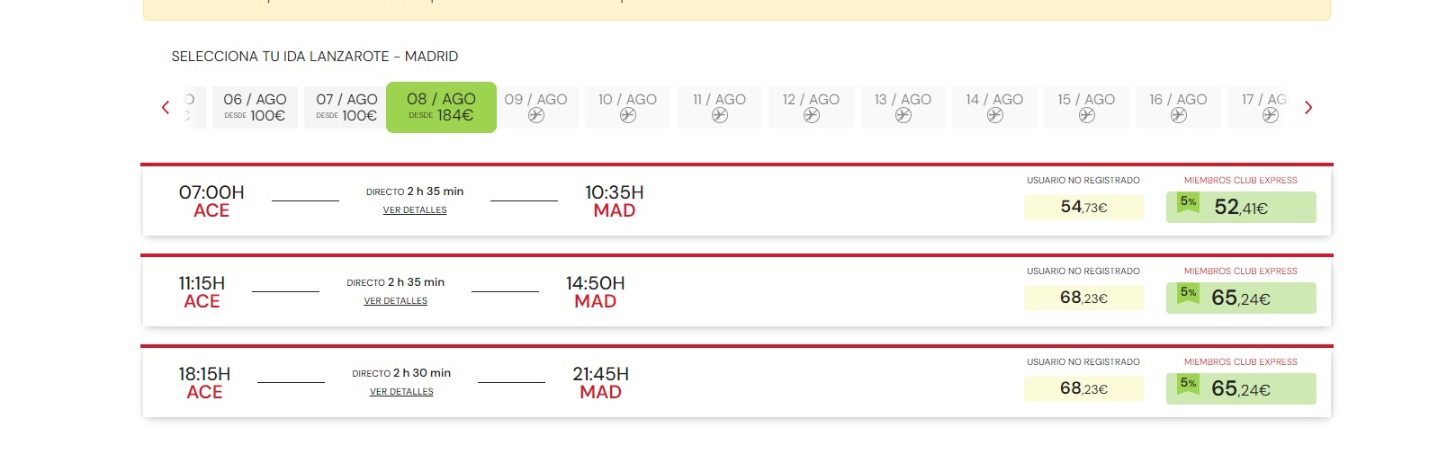 Tarifa para viajar en agosto desde Lanzarote a Madrid.