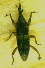 La diocalandra frumenti es un coleóptero que ataca taladrando a las palmeras. Sus huevos son depositados en las grietas de las raíces adventicias de la base del tallo, en la inflorescencia o en la base de los pecíolos. La larva se alimenta realizando galerías en hojas y fuste que serán el lugar de formación de las pupas. Los adultos tienen una longitud de 6 a 8 milímetros. Son oscuros, casi negros y tienen cuatro manchas más claras en los élitros. El tiempo desde la puesta de huevos hasta adulto es de 2,5 a 3 meses.