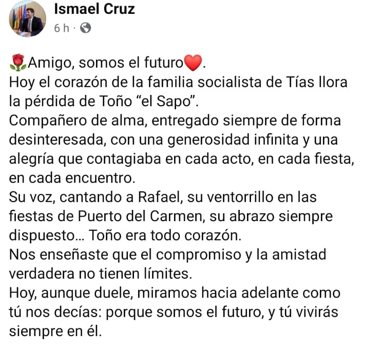También tuvo una fuerte influencia en la política de Tías, vinculado siempre al bando socialista, pero era un hombre muy querido por todo el mundo como muestra incluso el popular Ayoze Pérez en sus redes sociales.
