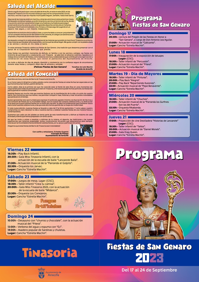 El Ayuntamiento de Arrecife, que preside Yonathan de León Machín, a través de la concejalía de Fiestas, que dirige Echedey Eugenio Felipe, invita a toda la ciudadanía a participar en las fiestas en honor a San Genaro que, desde hoy y hasta el próximo día 24, celebra el barrio capitalino de Tinasoria.