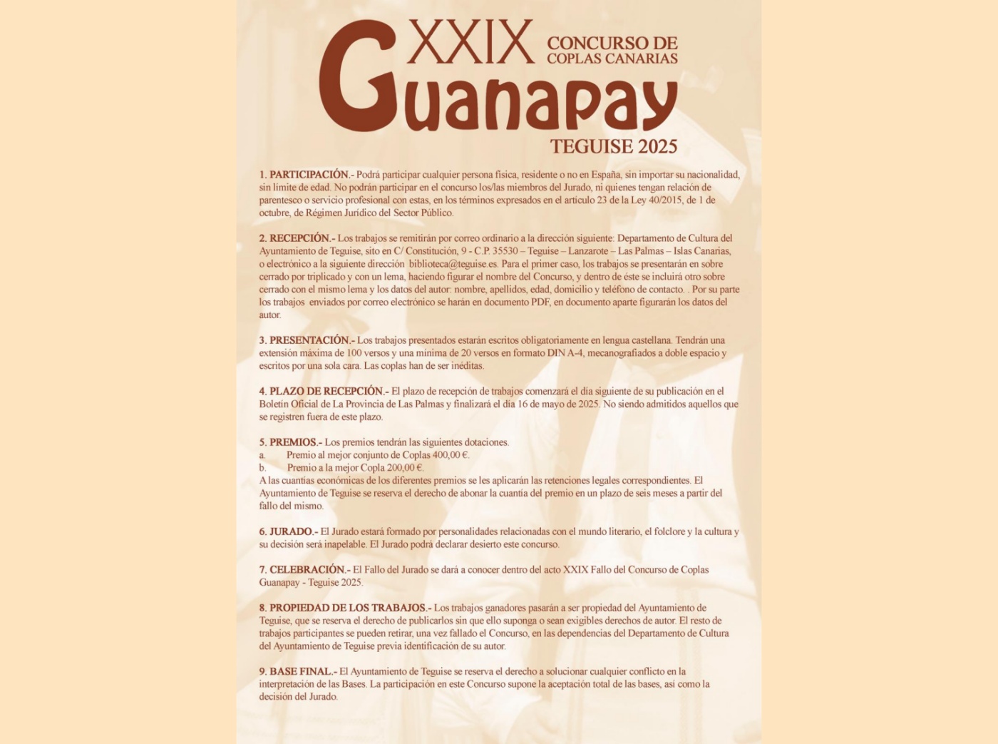 El Ayuntamiento de Teguise anuncia la convocatoria del XXIX Concurso de Coplas Guanapay, una cita destacada en el calendario cultural del municipio que abre sus puertas a todos aquellos interesados en mostrar su creatividad y rendir homenaje a la tradición a través de los relatos cortos.
