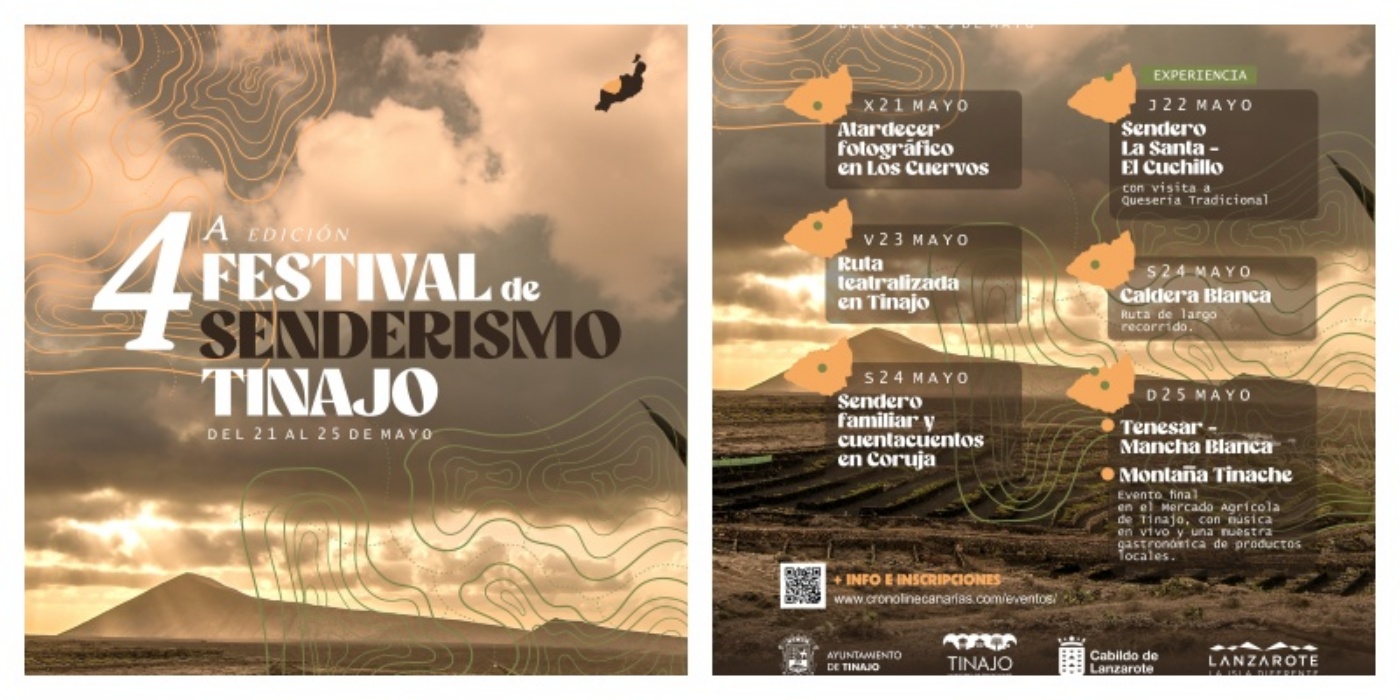 El Ayuntamiento de Tinajo ha anunciado que el IV Festival de Senderismo de Tinajo se celebrará a través de siete rutas del 21 al 27 de mayo de 2025, organizado por la Concejalía de Deportes del Ayuntamiento de Tinajo, con el patrocinio de Turismo Lanzarote y las rutas guiadas e interpretadas por Senderismo Lanzarote.
