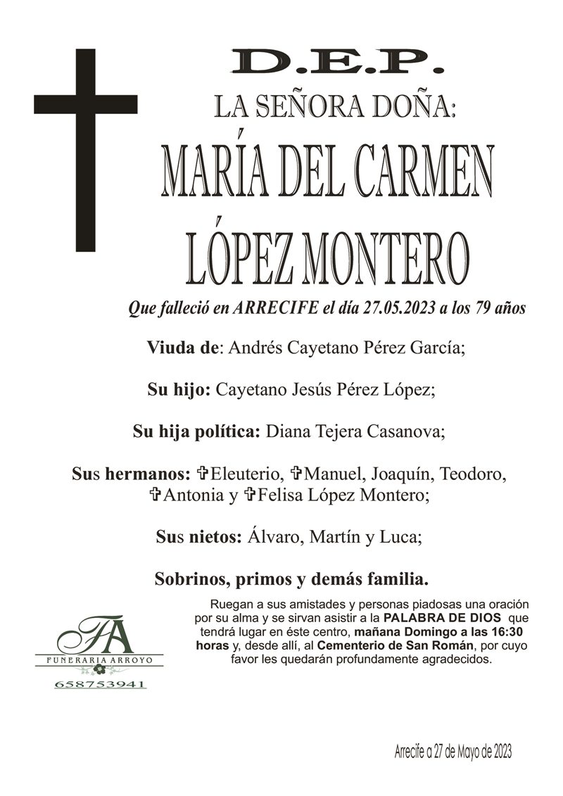 Que falleció en ARRECIFE el día 27.05.2023 a los 79 años