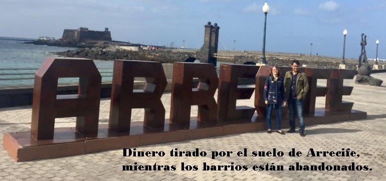 Post datum:. El Ayuntamiento de Arrecife no solo comete faltas de ortografía, también mal usa el dinero de los contribuyentes en monumentos innecesarios, olvidándose de las precarias situaciones y condiciones por las que atraviesa la ciudad que posee unas 2.000 viviendas abandonadas llenas de basura y ratas, barrios abandonados sin calzadas asfaltadas, sin drenajes, sin aceras, etc. Más dos islotes dejados de la mano del Cosmo Poder. Institutos y escuelas en estado tercermundista y el Puente las Bolas en ruina. Pero según alegan los políticos que gobiernan el Consistorio de Arrecife, todo va en perfecta rienda hacia la prosperidad.