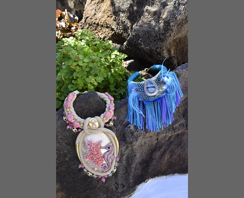 La alta bisutería de Mosego es diferente a todo lo que se suele ver en tiendas y colecciones. “Mis piezas, collares, pecheras, pulseras, puños, brazaletes, pendientes, anillos… todo es muy grande, muy colorido y muy llamativo. Son joyas para gente sin complejos que no le importe destacar y, sobre todo, que las sepa lucir”, explica. “Yo no concibo la vida sin color, verdes, azules, amarillos intensos, y mis trabajos son un fiel reflejo de lo que hay dentro de mí”.