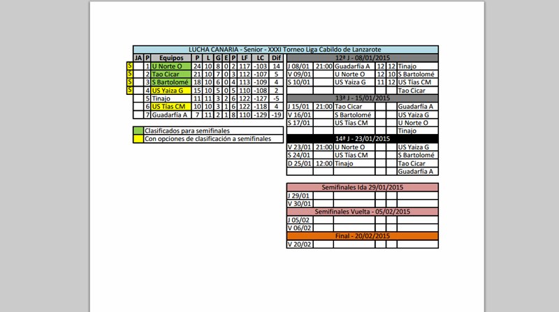 La XXXI Liga Cabildo de Lanzarote de lucha canaria en categoría sénior se acerca al final de su fase regular que dará paso a las semifinales. En la duodécima jornada celebrada el pasado fin de semana, el liderato quedó en solitario para el Unión Norte Orvecame tras imponerse por 12 a 10 al San Bartolomé, aventajando en 3 puntos al Tao Cicar que libraba.