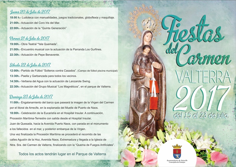 El primer día está previsto el Encuentro de Música Popular Parranda Janubio con la presentación además del grupo Parranderos y Punto, invitado de Tenerife. El día grande, el 16 de julio, será la función solemne y luego procesión terrestre a partir de las 19 horas para finalizar por la noche con el concierto de Manny Manuel y Ángel López, ex vocalista de Son By Four, en la Plaza del Carmen.