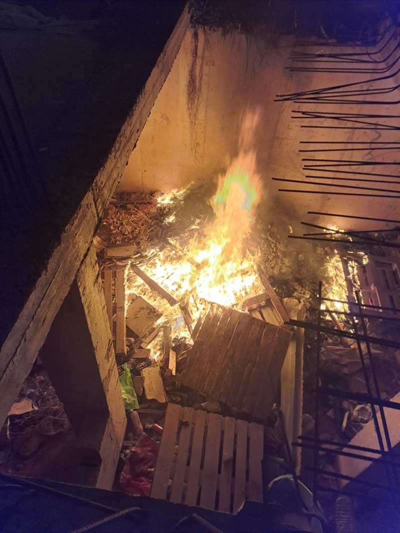Los bomberos apagaron el fuego que se inició en una montaña de palets y basura acumulada en la planta baja de la obra