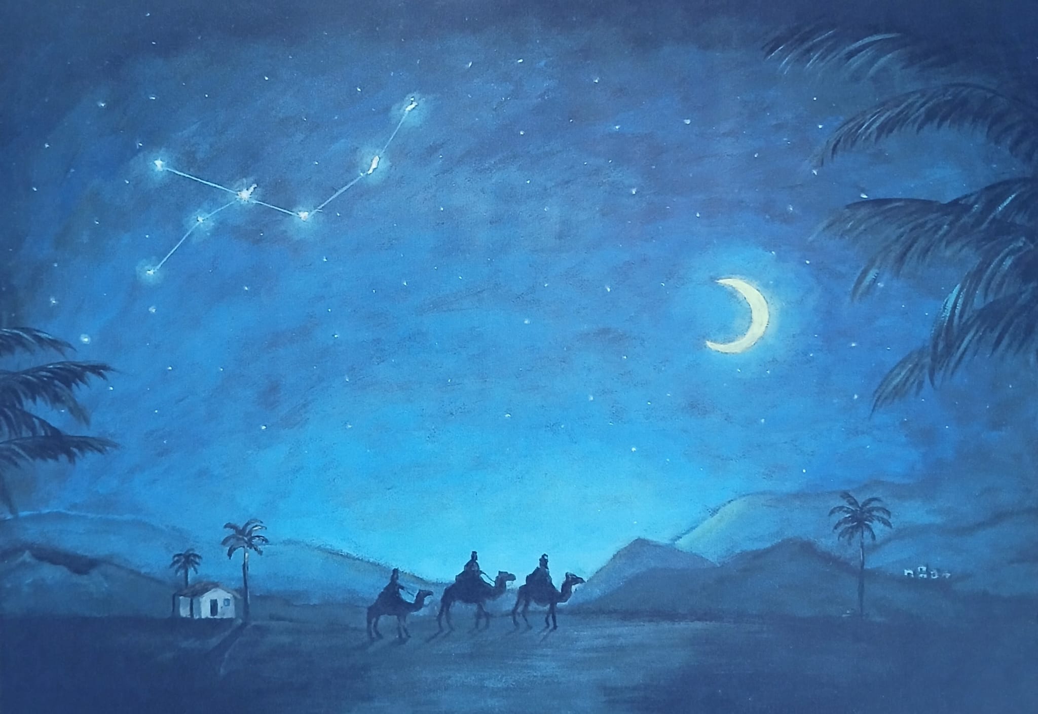 La postal reproduce una escena nocturna en la que una constelación formada por las 8 islas del Archipiélago canario orienta durante la noche a los Reyes Magos