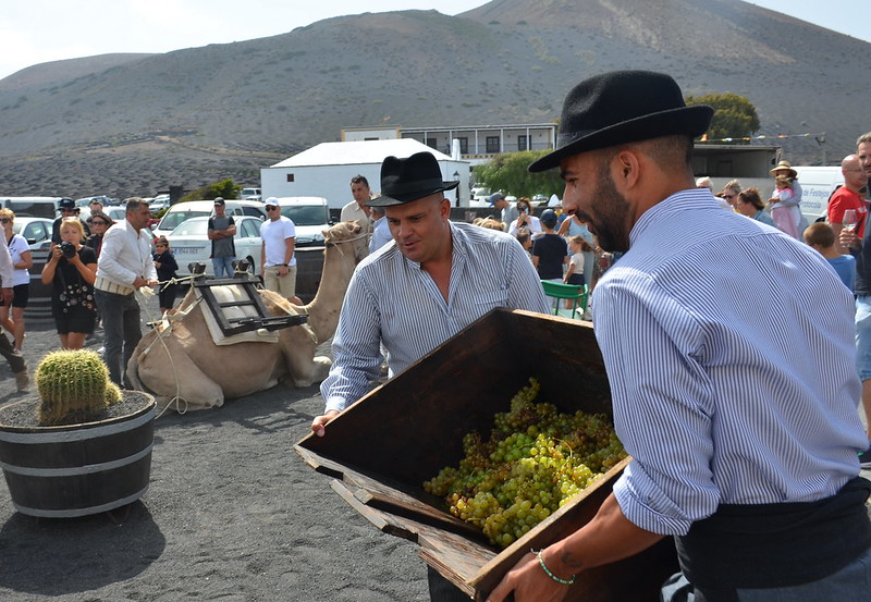 Cientos de personas acudieron a la recogida de la uva con camello en La Geria