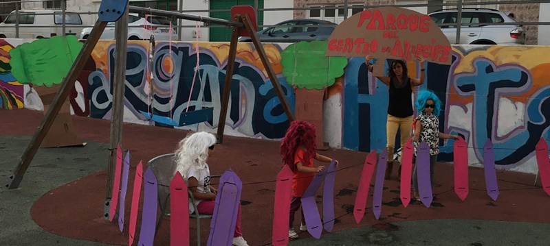 Los vecinos del barrio capitalino emiten una original protesta por la falta de columpios de la que adolecen