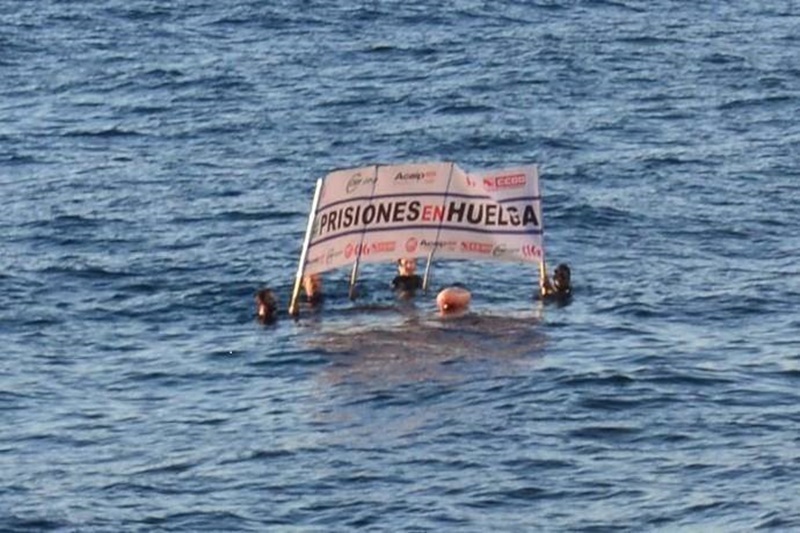 Un grupo de funcionarios de la cárcel de Tahíche trataban de llamar la atención de Pedro Sánchez desplegando desde el mar una pancarta reivindicativa con la frase #PrisionesEnHuelga