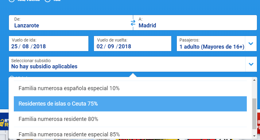 Si vas a comprar un billete para volar a la península, no aparece la opción de la bonificación por residente canario