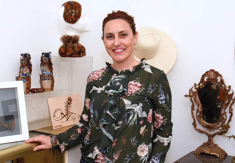 Tocados, sombreros, pamelas, zapatos, bolsos, pajaritas, broches, cinturones… nada se resiste a las manos y a la imaginación de esta joven y creativa artista
