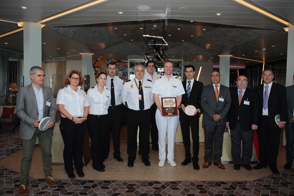 Ángel Vázquez dio la bienvenida ayer en el Puerto de Arrecife al capitán del barco, junto al director gerente de Turismo Lanzarote
