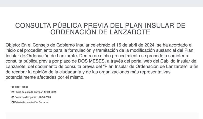 Desde este miércoles comienza el plazo de esta consulta pública previa a través de la página web del Cabildo insular