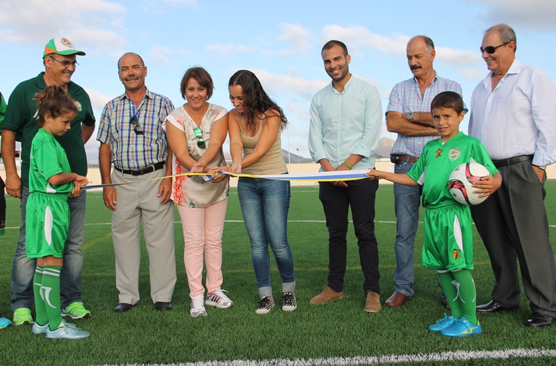 Representantes del Cabildo de Lanzarote y el Ayuntamiento de Yaiza inauguran la instalación en el partido de Tercera división en el que el Unión Sur Yaiza venció 1 - 0 al Unión Puerto de Fuerteventura