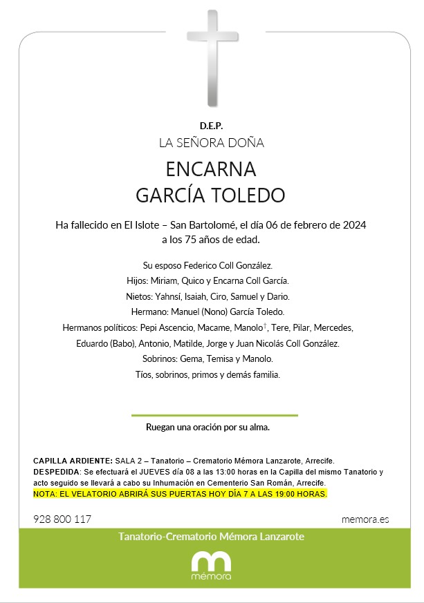 Este martes 6 de febrero fallecía en su domicilio en el Islote, Encarna García Toledo, a la edad de 75 años