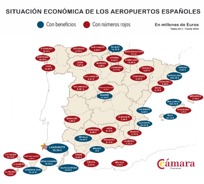 En el gráfico pueden comprobar la abultada cantidad de aeropuertos deficitarios (34) y que nadie se explica por qué se mantienen abiertos, cuando una buena parte son innecesarios, sobre todos los implantados en el territorio continental. Solo los aeropuertos de Barcelona (339,28 Millones €), Mallorca (158,78 M. €), Tenerife Sur (73,41 M. €), Gran Canaria (70,33 M. €) y Alicante (50,53 M. €), superan a Lanzarote. Fuerteventura ocupa el noveno puesto con unos beneficios de 20,66 millones de euros. El beneficio del Aeropuerto de Madrid es de 27,64 millones de euros, teniendo en cuenta que aún amortiza los 7.200 millones de euros que costó la construcción de la Terminal 4, puesta en funcionamiento en el 2006. Los restantes aeropuertos con beneficios son Málaga (18 M. €), Sevilla (16,40 M. €) Bilbao (14,38 M. €) y Valencia (9,22 M. €)