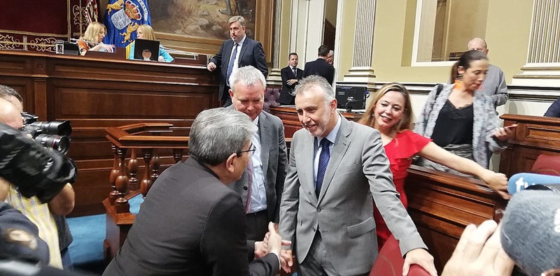 El presidente de Canarias ha sido investido con el voto a favor de 37 diputados (25 del PSOE, 5 de Nueva Canarias, 4 de Sí Podemos y 3 de ASG) y el voto en contra de 31 (19 de Coalición Canaria, 10 del PP y 2 de Ciudadanos), con dos ausencias -una en las filas del PP y otra de CC-.
