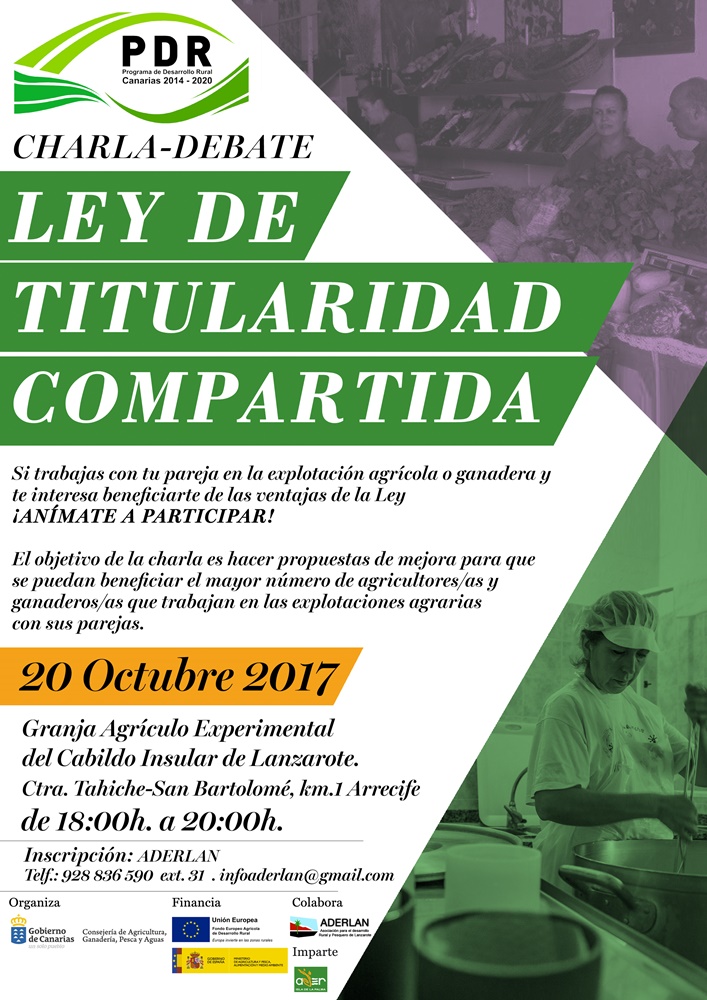 La Dirección General de Agricultura de la Consejería de Consejería de Agricultura, Ganadería, Pesca y Aguas del Gobierno de Canarias ha puesto en marcha un programa de charlas-debates sobre la Ley de Titularidad Compartida, que regula el registro de las explotaciones agrarias a nombre del matrimonio o pareja unida por análoga relación de afectividad para la gestión conjunta de dicha instalación, conocido como Reticom. Estas jornadas se celebrarán entre el 16 y el 24 de octubre en todas las Islas.