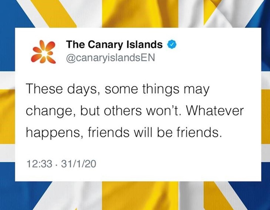 La Consejería de Turismo, Industria y Comercio del Gobierno de Canarias, que dirige Yaiza Castilla, ha querido reforzar la promoción turística en torno a la fecha oficial del brexit con una nueva edición de su campaña 'Whatever happens, friends will be friends' (Pase lo que pase seguiremos siendo amigos), con la que apela a la histórica vinculación entre Reino Unido y las Islas.