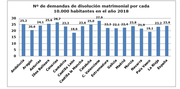 Tan sólo la Comunidad Valenciana, con una tasa de 27,9 demandas por cada 100.000 habitantes -1,2 puntos más- superó al Achipiélago el año pasado en volumen relativo de demandas matrimoniales. La comunidad con menos pleitos civiles de este tipo fue Castilla y León, con una tasa del 18,6.