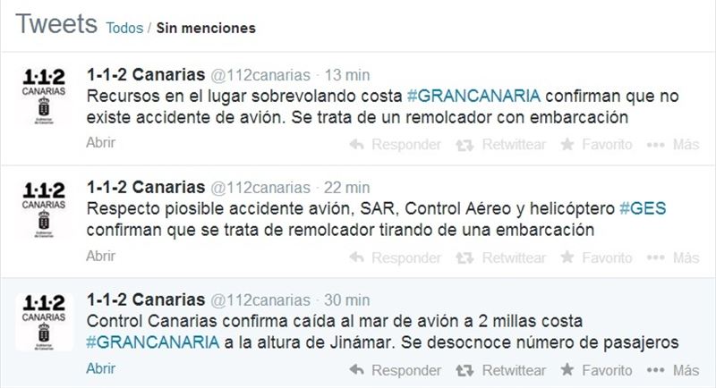 La Unidad de Comunicación del 112 Canarias asegura que informó hoy por su cuenta de Twitter de que un avión se había accidentado cerca de la costa de Gran Canaria tras la información recibida del Centro de Control del Aeropuerto desde un terminal tetra, de la Red de Emergencias de Canarias, especialmente designada para la comunicación de emergencias.