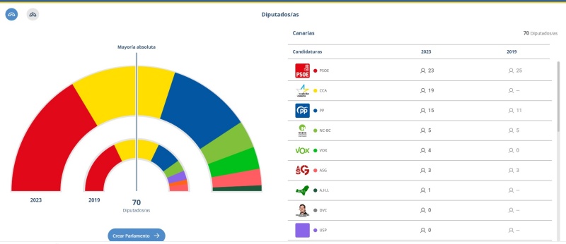 Con el 86,40% de votos escrutados correspondientes a la circunscripción insular y el 70,86% de la autonómica, en la XI Legislatura habrá siete formaciones políticas en el Parlamento de Canarias. Así, en la circunscripción insular el PSOE obtiene con esos porcentajes de votos escrutados 19 escaños; CC obtiene 17; el PP, 14; NC, cuatro; Vox, tres; ASG, tres; y AHÍ, uno.