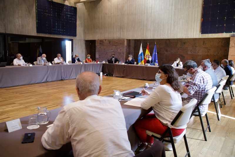 El presidente de Canarias, Ángel Víctor Torres, se reunió esta tarde, tras el Consejo de Gobierno celebrado en Santa Cruz de Tenerife, con representantes de los grupos parlamentarios (PSOE, CC, NC, Sí Podemos y ASG), los cabildos (Fecai), municipios isleños (Fecam), entidades empresariales (CEOE y CCE), sindicatos (UGT y CCOO), cámaras de comercio, Tercer Sector y de los colegios profesionales de Trabajo Social que firmaron el pasado 30 de mayo el Pacto por la Reactivación Social y Económica de las Islas por la pandemia del Covid-19.