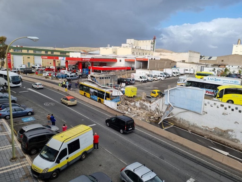 Impactantes imágenes las que está dejando la borrasca Celia en toda Canarias. Tal y como se puede ver en los vídeos que nos han hecho llegar a la redacción de Lancelot Digital, el viento fue el causando de derrumbar una valla publicitaria y parte de un muro sobre una guagua municipal en el barrio de Las Torres de Gran Canaria.