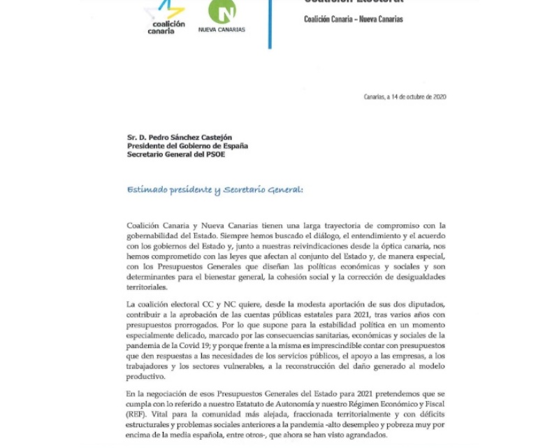 En la misiva que ya ha sido registrada en la sede de la Presidencia del Gobierno estatal, CC y NC recuerdan que tienen una “larga” trayectoria de “compromiso” con la gobernabilidad del Estado. De manera especial, y junto a las reivindicaciones de la comunidad canaria, en la carta se recuerda que “nos hemos comprometido” con las leyes que afectan al conjunto del Estado, en especial, con los PGE, “determinantes” para el bienestar general, la cohesión social y la corrección de desigualdades territoriales.