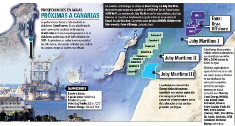 La petrolera escocesa Cairn Energy ejecutará el permiso dado en su día por Marruecos para buscar petróleo en su zona marítima, frente a las costas de Lanzarote y Fuerteventura, y cerca de los sondeos previstos por Repsol. En el Puerto de la Luz de Las Palmas de Gran Canaria, ya se encuentra fondeada la plataforma mediante la que se llevarán a cabo las exploraciones.