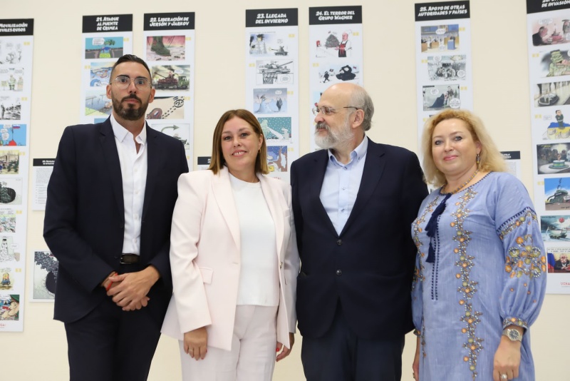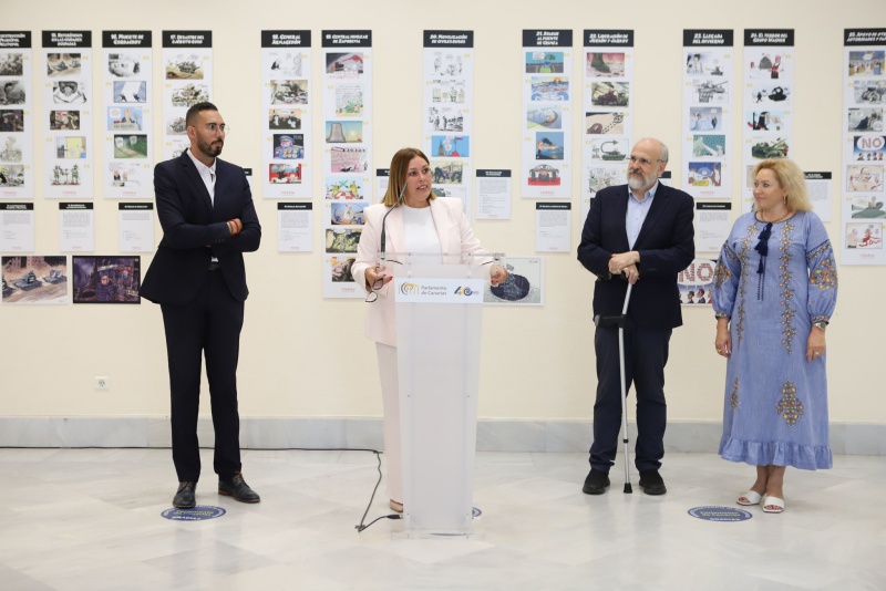 El Parlamento de Canarias inauguró este miércoles 25 de octubre la exposición Ucrania: la guerra en viñetas, que reúne más de 300 publicaciones cómicas de medios de comunicación de diversos países del mundo, donde se ofrece, a través del humor y la sátira, una visión muy crítica sobre la invasión rusa de Ucrania. “Esta Cámara se pone al servicio de la cultura y la reflexión, esta vez con una apuesta valiente de dibujantes europeos y estadounidenses que nos traen Lucas Morales y Francisco Pomares, a través de la Fundación Canaria Cine Más Cómics”, según señaló en su discurso de inauguración la presidenta del Parlamento canario, Astrid Pérez.