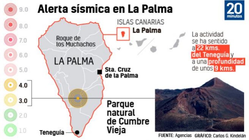 La Isla de la Palma está en alerta por la actividad sísmica. El Instituto Geográfico Nacional (IGN) ha informado de que durante las primeras horas de este martes se han localizado más de un centenar de movimientos sísmicos en la isla, uno de ellos de magnitud 3,9. Estos movimientos sísmicos están ligados a un aumento de la actividad volcánica de la isla por lo que se van a prolongar durante un tiempo y "antes o después habrá una erupción, pero es lo normal, no va a ser una tragedia", explica el doctor Luca D'Auria, director del área de vigilancia volcánica del Instituto Volcanológico de Canarias (Involcan).