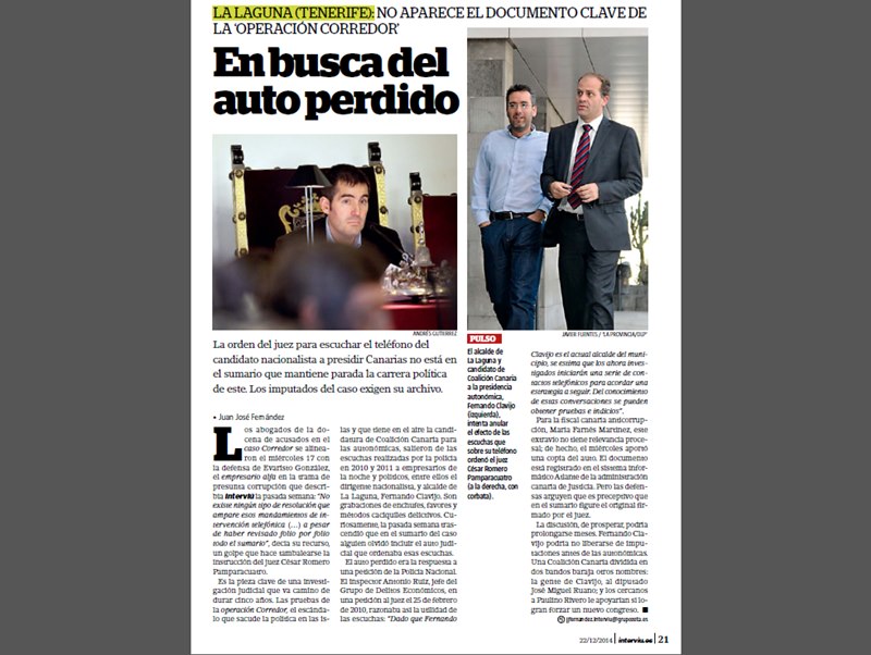 Si la pasada semana era el prestigioso diario El Mundo el que cuestionaba las instrucciones realizadas por el juez César Romero Pamparacuatro, días antes lo hacía la conocida revista de tirada nacional Interviú. En un artículo titulado 'En busca del auto perdido', destacaba que la orden del juez para escuchar el teléfono del candidato de CC a presidir el Gobierno de Canarias, Fernando Clavijo, no está en el sumario.