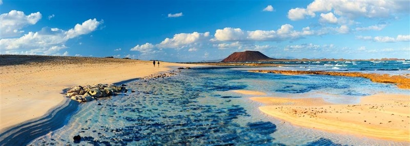 En la descripción que ofrecen de estas playas hablan de "largos arenales colorean de tonos dorados el litoral norte de Fuerteventura, una de las zonas más seductoras y con mayor valor ecológico de las Canarias. Frecuentadas por windsurfistas, las playas de Corralejo tienen su mayor tesoro en el Parque Natural de las Dunas de Corralejo y en la Reserva Natural de la Isla de Lobos, cuyos fondos son muy apreciados por los submarinistas. En el otro extremo de Fuerteventura, la playa de Costa Calma se alarga casi dos kilómetros por una franja que, con marea baja, puede recorrerse de punta a punta".