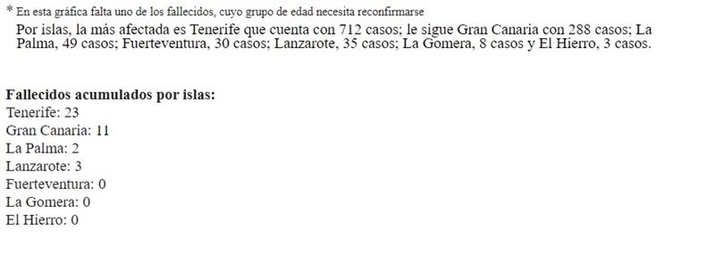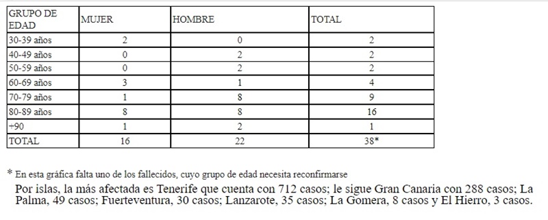 La Consejería de Sanidad del Gobierno de Canarias constata un acumulado de 1125 casos acumulados de coronavirus COVID-19 a cierre de la estadística epidemiológica que remitió al Ministerio de Sanidad a las 20:00 de este sábado. En ese informe se refleja también que el número de altas acumuladas es de 30 y el de personas fallecidas es de 39, produciéndose tres fallecimientos más que el día anterior. De los 1125 casos positivos, 425 han requerido hospitalización y de ellas 78 han requerido UCI. El número casos en profesionales sanitarios es de 220.
