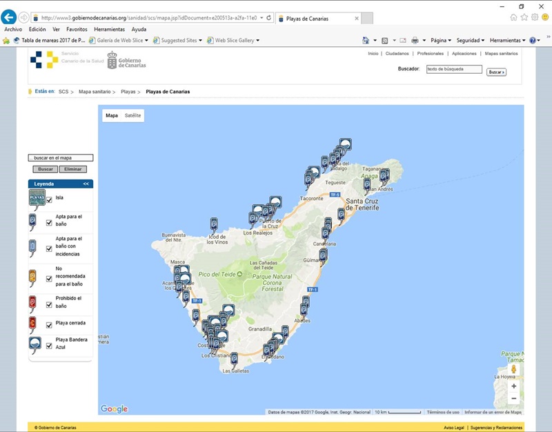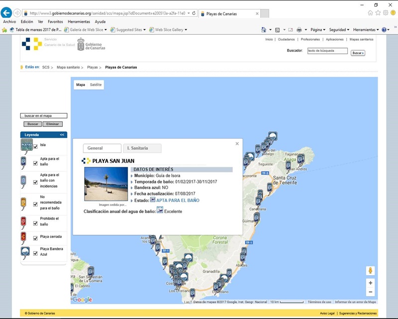 Basta entrar en la web de la consejería de sanidad, www.gobiernodecanarias.org/sanidad y pinchar en el destacado correspondiente, para acceder al mapa geolocalizado de playas. Al acceder a la playa sobre la que se desea información y pasar el cursor por ella se abren dos pestañas, una de información general y otra de Información Sanitaria de la zona de baño.