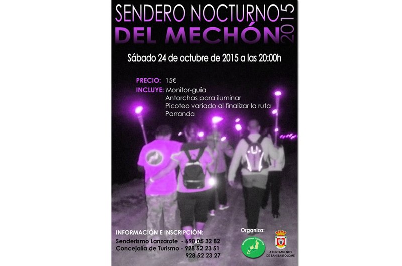 “Sendero nocturno del Mechón”. El sábado 24 de octubre, a las 20.00 horas, tendrá lugar el sendero nocturno del Mmechón, teniendo como punto de encuentro la Plaza León y Castillo a la altura de la Sociedad El Porvenir de San Bartolomé. Duración aproximada: dos horas. Aquellos interesados podrán solicitar información e inscripción en Senderismo Lanzarote, llamando al 690 05 32 82 o en la concejalía de turismo ubicada en la Casa Cerdeña o llamando a los teléfonos 928 52 23 51 / 928 52 23 27.