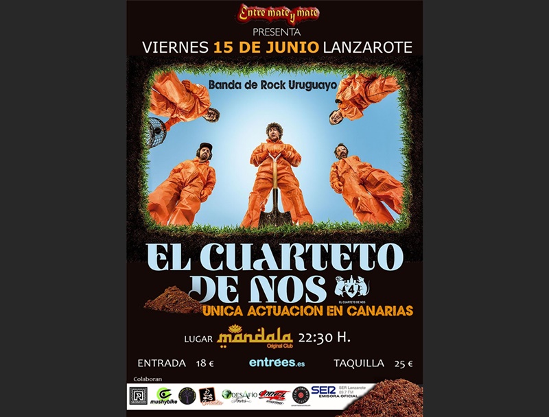 Llega a Lanzarote el Cuarteto de Nos, la mejor banda de rock uruguayo, y lo hace el 15 de junio, a las 22:30 horas, en la Discoteca Mandala de Arrecife, en la que será una actuación única en Canarias. Entradas: 18 euros, anticipadas y 25 euros, en taquilla.