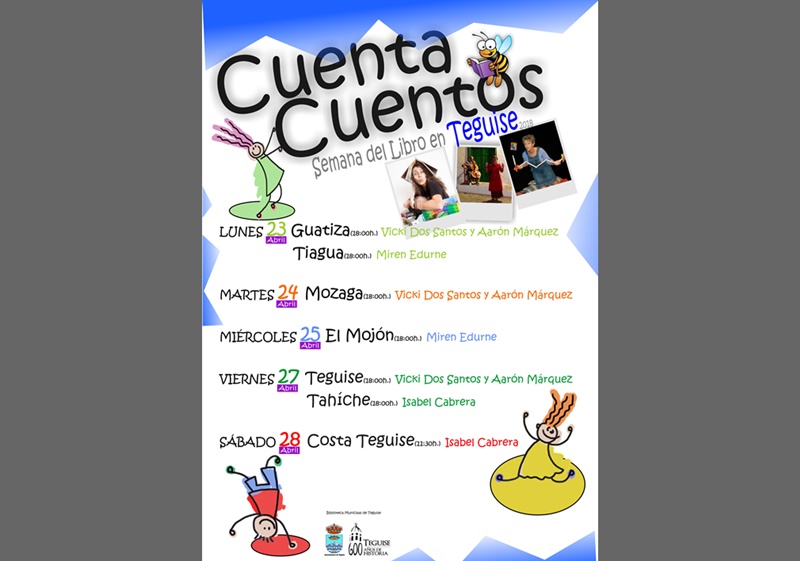 Del 23 al 28 de abril: Sesiones de cuentos familiares en la Red de Bibliotecas de Teguise. Para conmemorar la Semana del libro, la Red de bibliotecas de Teguise organiza sesiones de cuentos familiares en distintos pueblos a cargo de narradoras profesionales: