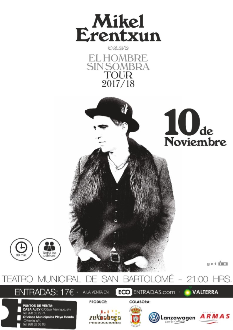 Mikel Erentxun. El cantante y su tour “El hombre sin sombra” llegan a Lanzarote el 10 de noviembre. La cita en el Teatro de San Bartolomé, a las 21:00 horas. Entradas: 17 euros.