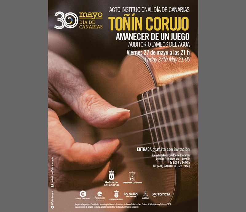 El Cabildo de Lanzarote celebrará el Acto Institucional del Día de Canarias el próximo viernes 27 de mayo, a las 21.00 horas, en el Auditorio de Jameos del Agua. El acto incluirá la representación de Amanecer de un juego, de Toñín Corujo, en lo que supondrá el estreno ante el público de este nuevo espectáculo del músico y compositor lanzaroteño.