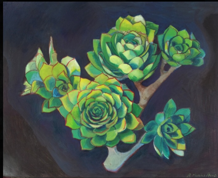 Durante el último año ha realizado una serie de cuadros inspirados en el paisaje de Lanzarote y Gran Canaria. "En especial me ha llamado la atención el Bejeque o 'pastel de risco', una planta que necesita muy pocos recursos para prosperar", dice la pintura novel que este próximo viernes presentará su primera exposición en el Espacio de Artes de la Sociedad Democracia.
