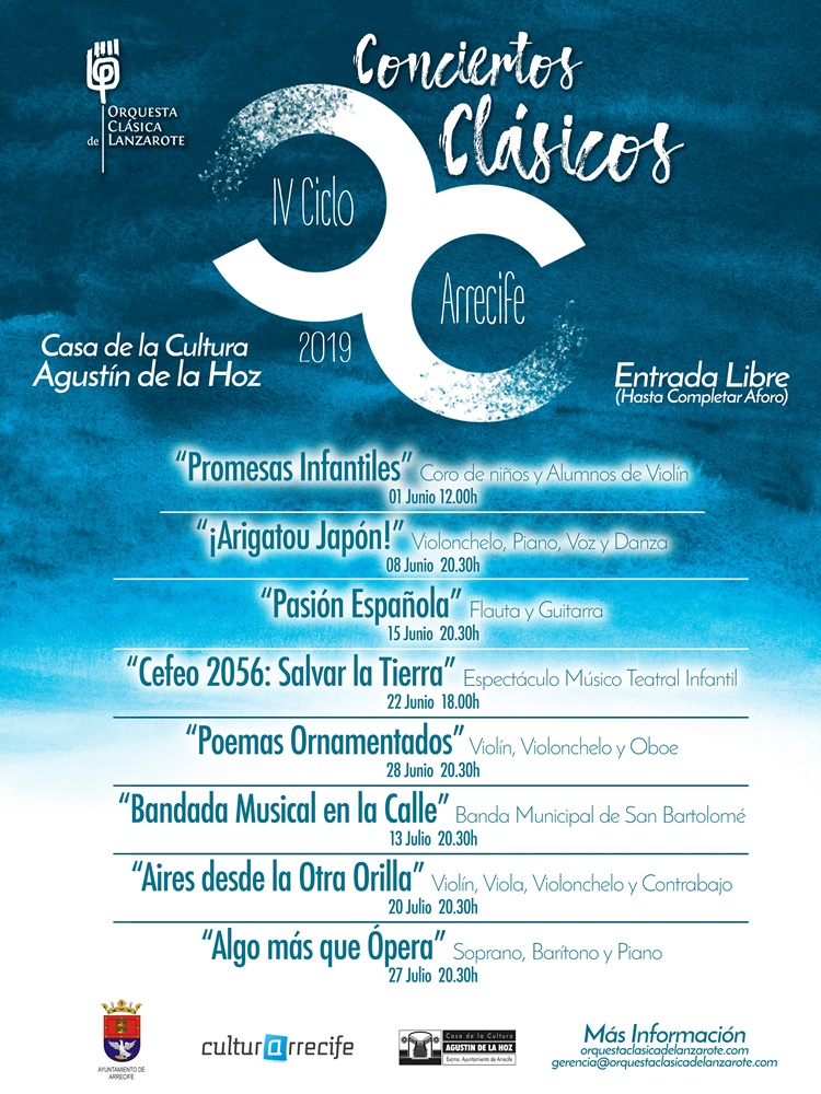 Los conciertos del mes de julio Bandada musical en la calle, a cargo de la banda de música de San Bartolomé, el sábado 13, Aires desde la otra orilla, -piezas para violín, viola, violonchelo y contrabajo-, el sábado 20 y Algo más que Ópera, con las voces de una soprano y del barítono lanzaroteño Borja Molina acompañados de piano, el sábado 27, cierran el IV Ciclo.